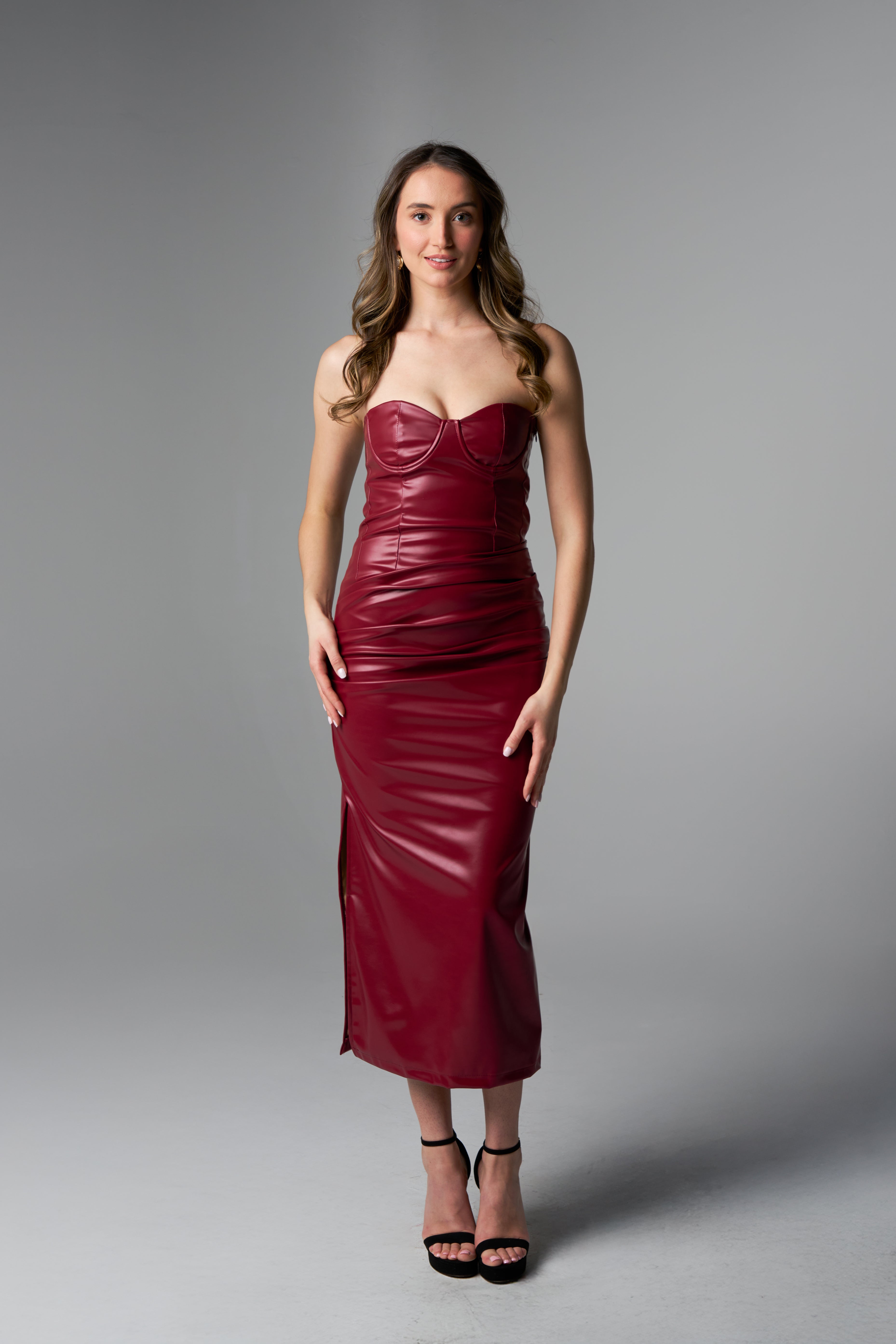 Meet Scarlett—where bold meets elegant. This faux leather midi dress combines a striking sheen with underwired support that keeps everything in place. The real showstopper? A meticulously engineered bodice featuring internal boning and asymmetric pleating that sculpts and defines with effortless grace. A cheeky side split adds just the right amount of sass to this otherwise refined silhouette. Dress up or dress down—Scarlett adapts to your mood while always looking impossibly polished.