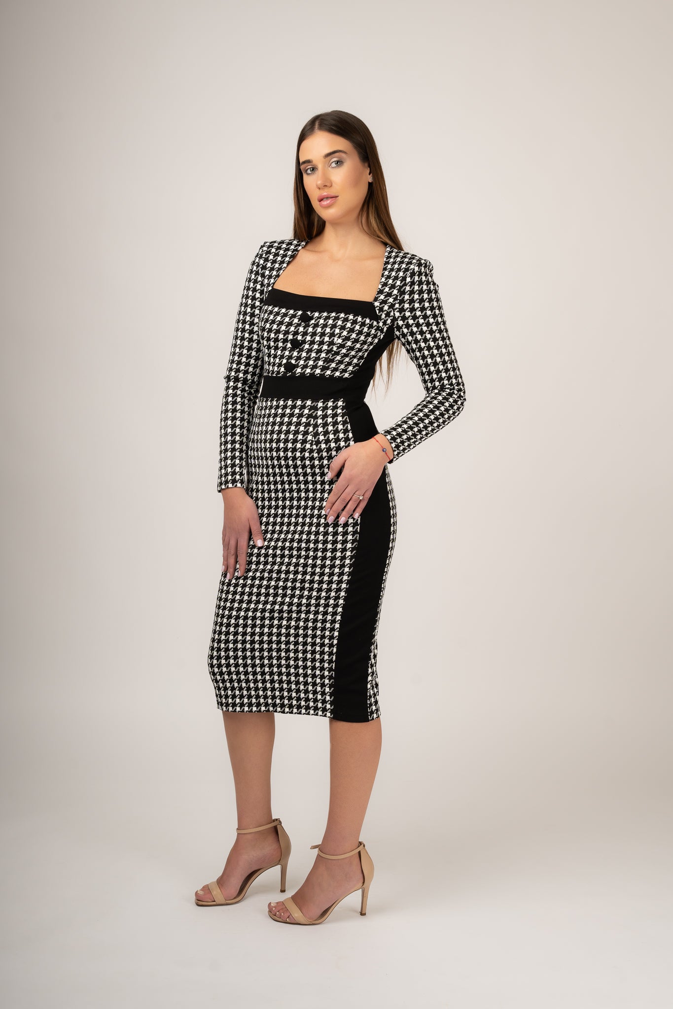Ready to make a statement? đ Look no further than the MISCHA dress! Its white and black pattern will have you looking đ„, while the MIDI length is perfect for keeping it classy. Slay all night in this stylish number! đ€©